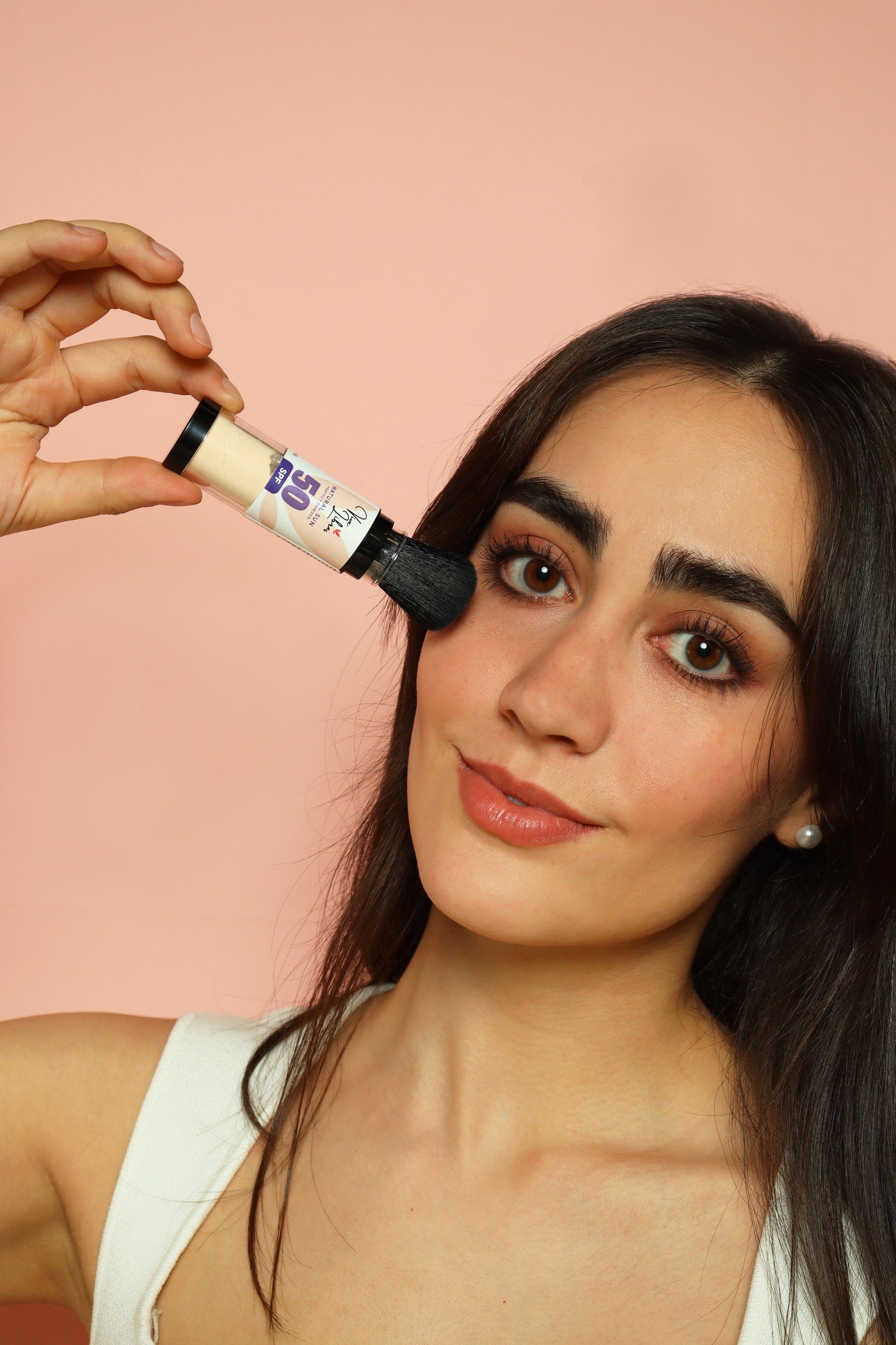 Modo de uso: Aplica el bloqueador en polvo sobre la piel seca con una brocha, distribuyendo uniformemente en rostro y cuello, reaplicando cada 2-3 horas o después de sudar.